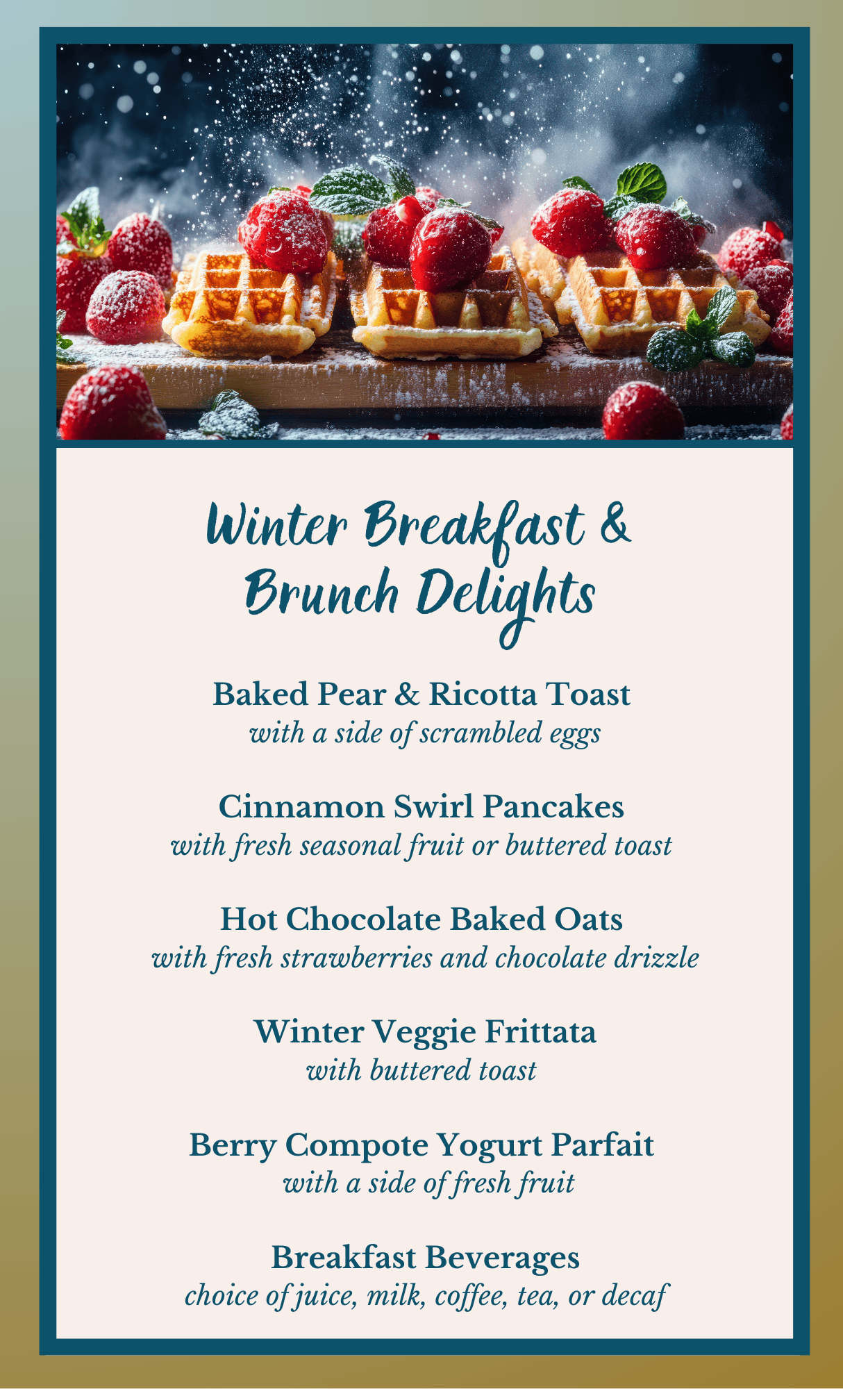 The Kensington’s dining team strives to make each meal a satisfying experience in every way. Excellence in cuisine, presentation, service, and atmosphere is our goal.