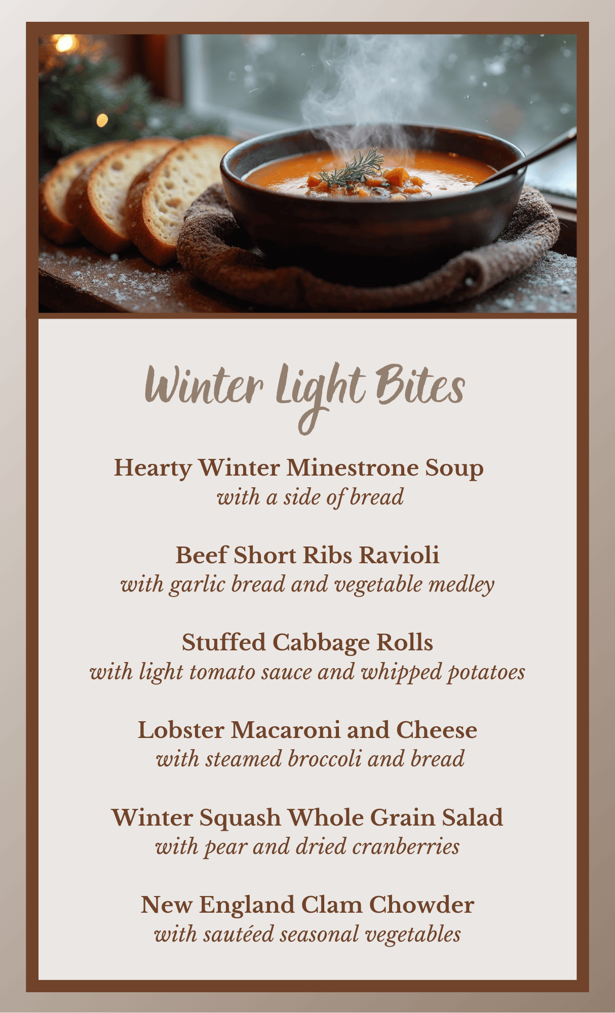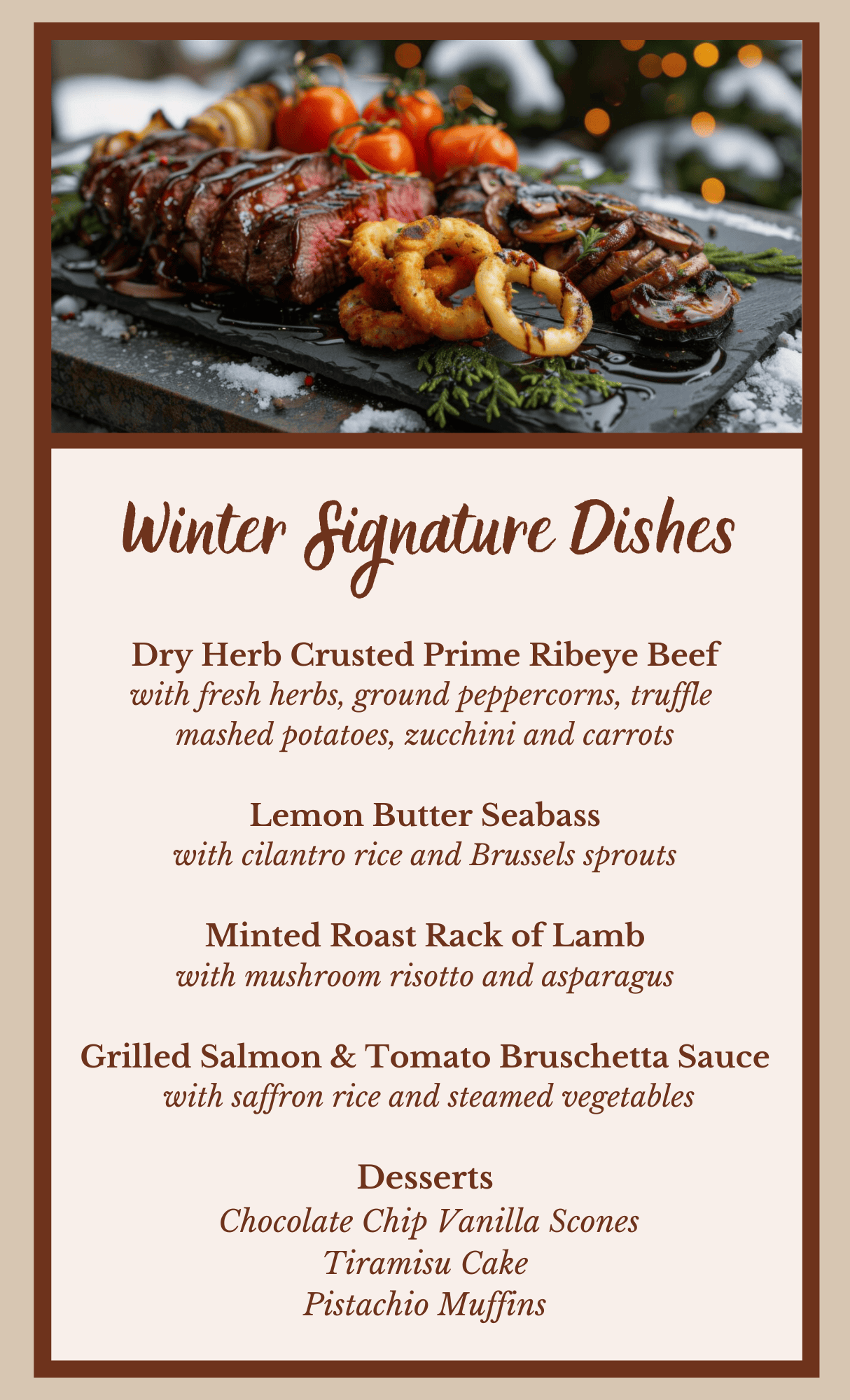 • Menu selections such as prime rib, grilled salmon, fresh vegetables, and much more